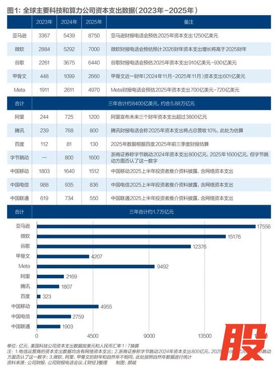 《财经》统计发现,微软、亚马逊、谷歌、甲骨文、Meta 2023年-2025年资本支出总额约8400亿美元(约合5.9万亿元),同期中国科技公司和电信运营商(包括阿里、字节跳动、腾讯、百度、中国移动、中国电信、中国联通)资本支出总额约1.7万亿元。