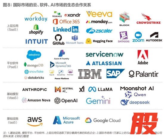 美国拥有庞大的软件生态作为支撑,这是其算力得以持续使用的关键。在公共云上,形成了IaaS(基础设施)、MaaS(模型平台)、PaaS(平台软件)、SaaS(应用软件)的完整生态。云厂商花费资本支出购买芯片提供算力,SaaS与PaaS通过服务客户持续消耗算力,模型公司训练基础模型提供AI能力。这形成了一个庞大的生态闭环。